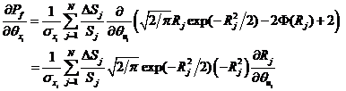 由式確定的失效概率Pf基本隨機變量對應(yīng)的標(biāo)準正態(tài)化變量分布參數(shù)的偏導(dǎo)數(shù),利用復(fù)合函數(shù)求導(dǎo)法則求得如式所示。